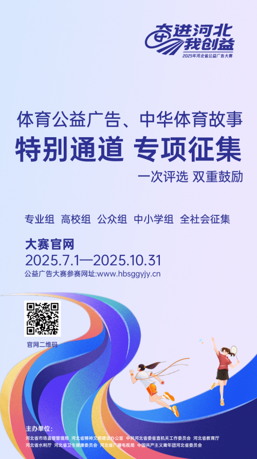 为配合中央宣传部文明培育局、国家广电总局传媒机构管理司、国家体育总局宣传司主办的体育公益广告与中华体育故事征集活动,大赛特面向全国增设“体育公益广告和中华体育故事”特别征集方向。参与该方向征集且作品质量优秀的作品,不仅可获得河北省公益广告大赛奖励,并且将报送至上述上述中央三部门主办的体育公益广告和中华体育故事征集活动,参与全国层面评审。一次参与,双重奖励,欢迎全社会各界参与投稿!