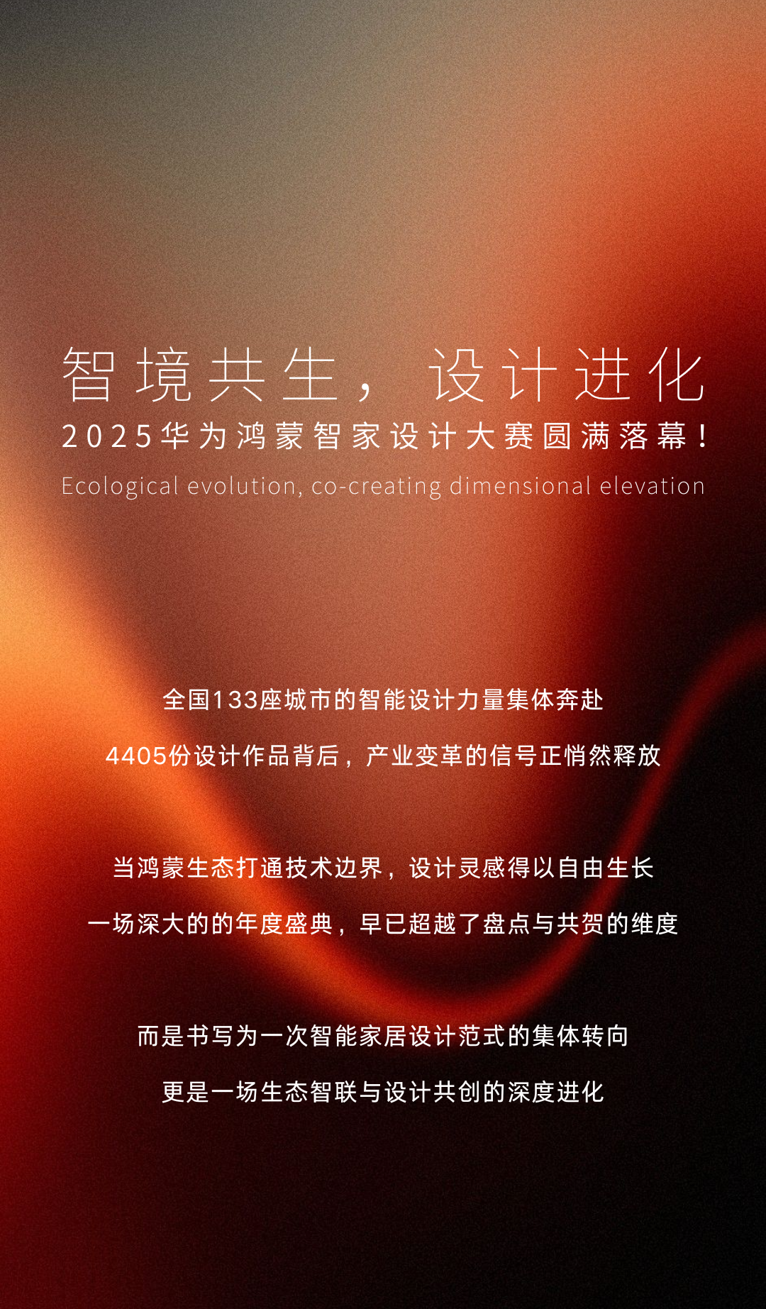 133座城市,4405套智能设计作品,3883位智装设计师奔赴,1000w+人对全屋智能家居生活的热情关注……一系列数字的升级背后,是2025华为鸿蒙智家设计大赛探索和重构未来人居的回响,更是智能生态进化,设计共创升维的叙事脉络。