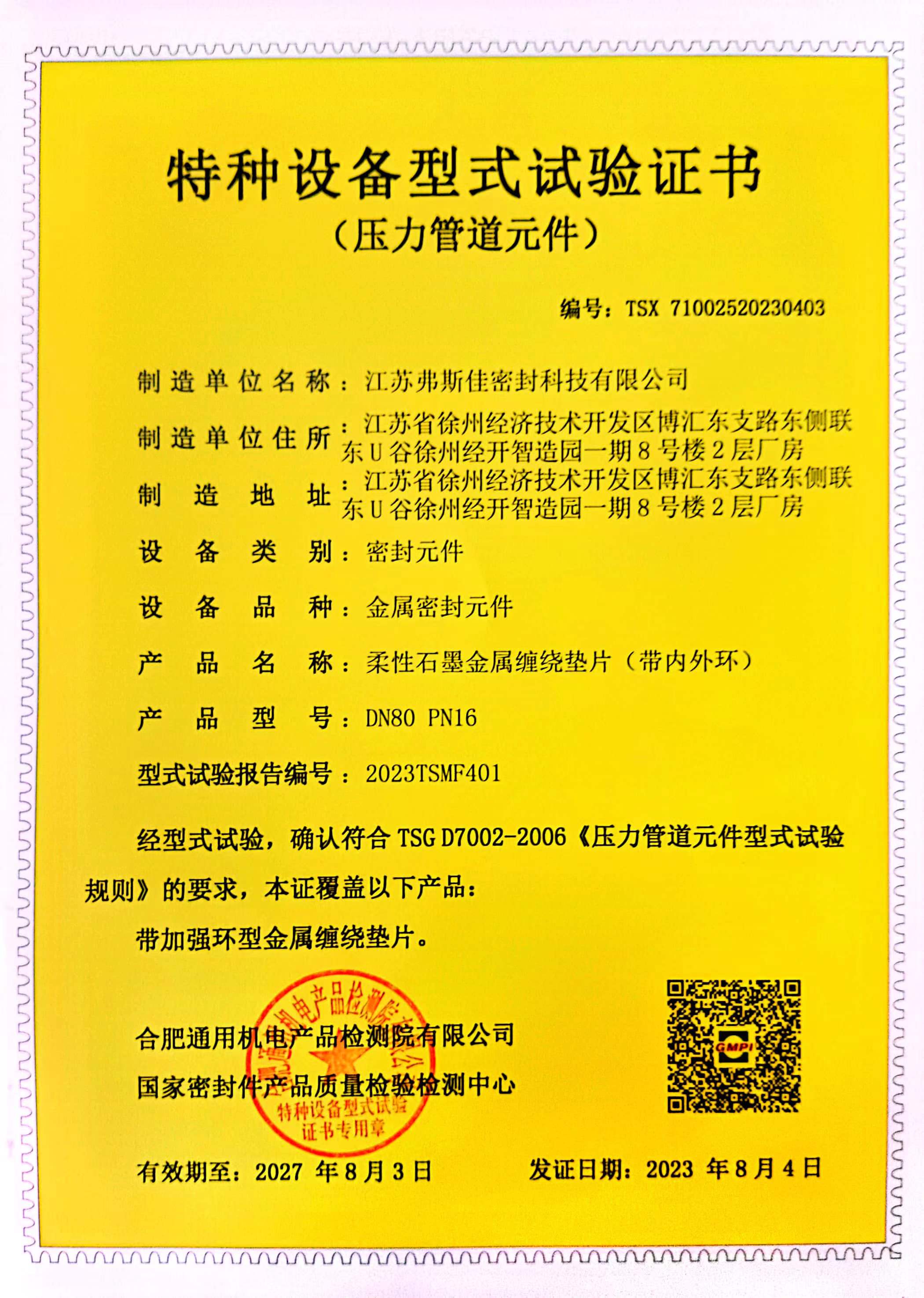 此外,从引用内容可知,江苏弗斯佳密封科技有限公司的柔性石墨金属缠绕垫片(基本型)和柔性石墨金属缠绕垫片(带内外环)均通过了合肥通用机电产品检测院有限公司、国家密封件产品质量检验检测中心的型式试验,《特种设备型式试验报告》显示其各项指标符合规定,综合判定型式试验合格。其制造的柔性石墨金属缠绕垫片(带内外环)还获得了编号为TSX71002520230403的《特种设备型式试验证书》。